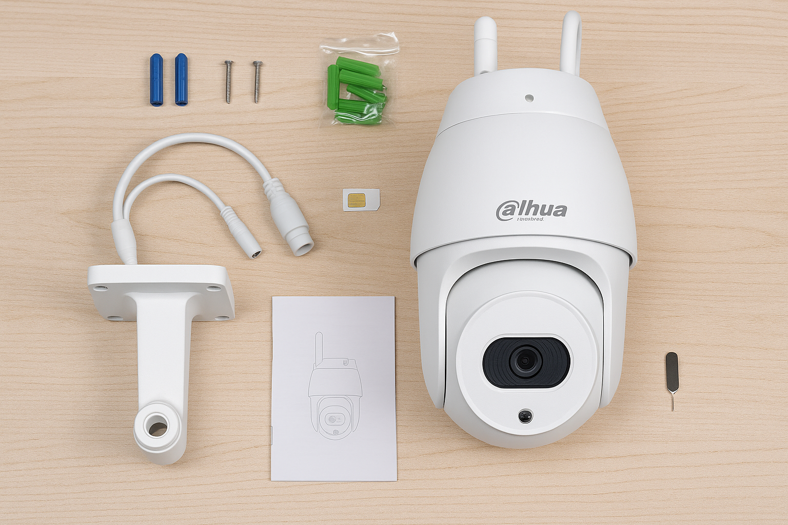 دوربین اصلی، آداپتور برق (در برخی مدلها اختیاری)، دو عدد آنتن 4G قابل باز شدن، دفترچه راهنما، پیچ و رولپلاک برای نصب پایه، کابل برق یا رابط ضدآب، و در برخی مدلها کارت گارانتی داهوا. توجه کنید که مدلهای فیک یا مونتاژ غیررسمی معمولاً فاقد آنتن دوم یا دفترچه با لوگوی رسمی Dahua هستند، بنابراین بررسی دقیق محتویات جعبه اولین گام در اطمینان از اصالت کالا محسوب میشود.